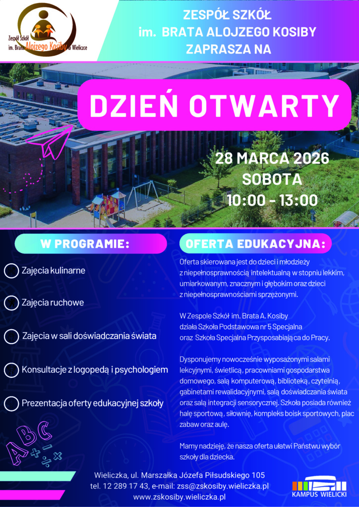 Zespół Szkół im. Brata A. Kosiby w Wieliczce serdecznie zaprasza na Dzień Otwarty w sobotę 28 marca 2026r. w godz. 10.00-13.00.